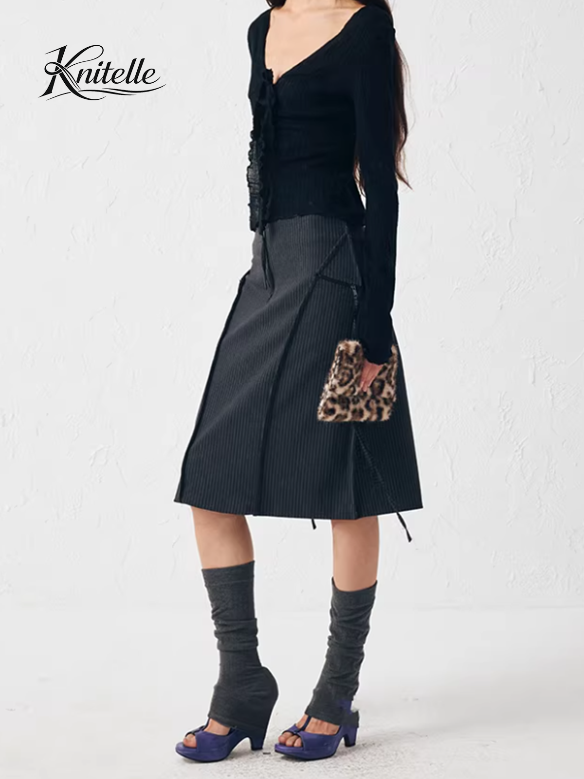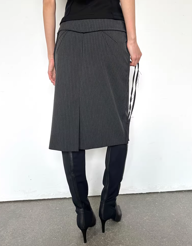 The skirt is designed in a straight-to-soft-A silhouette, creating a clean vertical line that elongates the lower body. The pleats naturally open with movement, adding rhythm and fluidity. The mid-length cut balances modesty with modern structure.