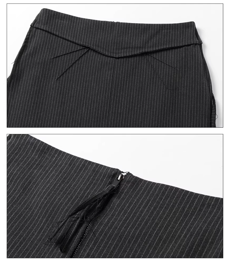 Crafted from a lightweight structured polyester-viscose blend with fine woven stripe detailing. The fabric has a soft matte surface with slight crispness, allowing pleats to hold shape while still flowing naturally.